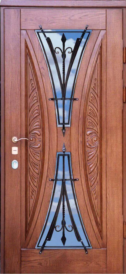 Основой отделки самой двери может служить массив натурального дерева (дуба, ясеня, сосны), натуральный шпон, МДФ-панель. Если речь идет о двери, которая будет устанавливаться на улицу, поверхность должна быть обработана атмосферостойкими материалами.